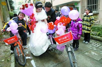 “四輪車人人結(jié)婚都會(huì)乘,兩個(gè)輪子的就少見(jiàn)了吧。 ”新郎孫軍說(shuō),現(xiàn)在政府提倡節(jié)能以保護(hù)環(huán)境,用租賃自行車迎親,既響應(yīng)了政府號(hào)召,又降低了婚禮成本。并且這種形式與眾不同,非常有紀(jì)念意義。新郎新娘都姓孫,在同一家房地產(chǎn)公司工作,在商量婚事時(shí),新娘希望能用一種別樣的方式來(lái)紀(jì)念他們的特殊緣分,于是這個(gè)自行車迎親方案立即得到了大家的青睞,“很特別,能讓人記一輩子”,新娘笑著說(shuō)。