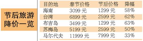 一路飆漲的旅游價(jià)格終于從今天開始大幅跳水。來自各大旅行社的報(bào)價(jià)顯示,與春節(jié)黃金周相比,即日起節(jié)后整體旅游價(jià)格下降三至四成,最高降幅超過六成。其中降幅最大的是春節(jié)期間漲至萬余元的三亞酒店房?jī)r(jià),節(jié)后跳水將近八成。
