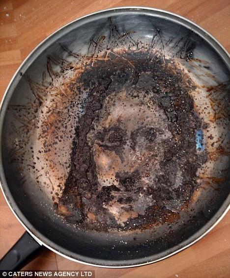 據(jù)英國《每日郵報》報道,英國一名22歲的銀行工作人員托比(Toby Elles)跟室友夜里在家中喝啤酒吃宵夜,但負(fù)責(zé)烹飪的他卻在沙發(fā)上睡著了,當(dāng)然熏肉也燒焦了,但鍋子沒有被燒破。當(dāng)托比把燒焦的熏肉刮除后發(fā)現(xiàn),鍋中剩余的油漬痕跡就像是一張人臉,搭配頭發(fā)、胡子,看起來就跟耶穌沒兩樣。