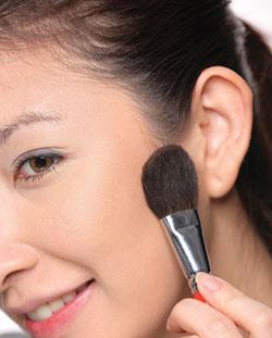 腮紅方面選用橘色腮紅,少量使用,制造出健康感的肌膚狀態(tài)。制造小臉效果在裸妝里同樣不能省略,只是在顏色選擇上,盡可能選擇自然的色調(diào),千萬不要因為貪圖更大的縮臉效果,就選擇深色的修容粉。將修容粉沿著發(fā)際到下頜的位置輕輕掃上去,是由外向內(nèi),靠近耳根的顏色最深。注意腮紅和陰影的銜接要自然過渡。