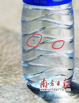 近日,有市民發(fā)現600毫升瓶裝的益力礦泉水內漂浮著黑色物質,大的有小指甲般,小的需要湊近才能看清。昨日,益力礦泉水東莞片區(qū)主管向消費者解釋說:那是水中鐵錳含量超標,喝了有益無害。但這位主管提供的水樣檢驗報告,恰恰缺漏了消費者發(fā)現有問題的批次。