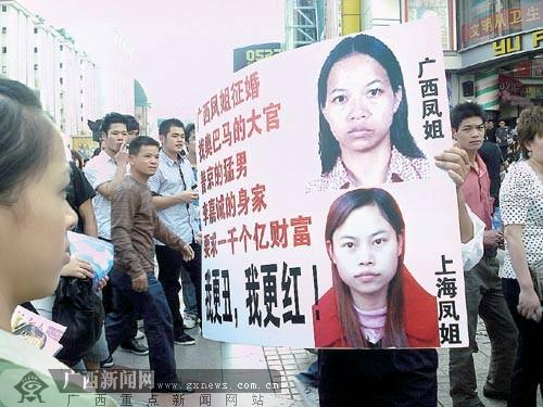 “找奧巴馬的大官、普京的猛男、李嘉誠的身價、要求一千個億財富……”4月11日下午,一男子在南寧市裕豐商廈門前,舉出“廣西鳳姐征婚”的廣告牌,聲稱要為自己的一位親戚——“廣西版鳳姐”征婚。當天在現(xiàn)場,所謂的“廣西鳳姐”故作神秘沒現(xiàn)身,但其開出的征婚條件卻“雷倒”了眾多圍觀市民。這也引起了一些好奇市民的猜想和質(zhì)疑:“廣西鳳姐”是不是想學(xué)新近的“網(wǎng)絡(luò)紅人”——羅玉鳳(“鳳姐”)來出名?