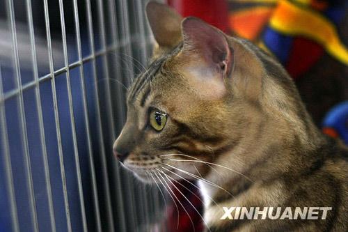 3月27日,在保加利亞普羅夫迪夫,一只孟加拉貓?jiān)趯櫸镓堈股险钩。為期兩天的普羅夫迪夫國際寵物貓展在這里舉行,200多只寵物貓參展。新華社發(fā)(維爾科·安科洛夫攝)