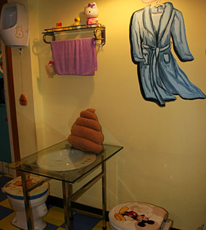在北京地安門外大街上,有一家衛(wèi)浴主題的餐廳,叫便便滿屋飯?zhí),看它的名字就知道,它絕對(duì)是一家很“特殊”的餐廳。便便滿屋飯?zhí)檬潜本┦准矣眯l(wèi)浴為主題的餐廳。
