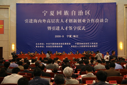 2009寧夏引進(jìn)海內(nèi)外高層次人才創(chuàng)新創(chuàng)業(yè)合作洽談會(huì)9月7日下午在自治區(qū)首府銀川召開。此次洽談會(huì)聘27名院士、17名專家為“自治區(qū)特聘顧問”,宣布建立8家院士工作站和11家專家服務(wù)基地。自治區(qū)政府和一些單位與柔性和全職引進(jìn)的專門人才簽署了相關(guān)框架協(xié)議、共建協(xié)議和聘用合同等。