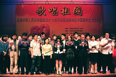中新網(wǎng)9月28日電 據(jù)外交部網(wǎng)站報(bào)道,9月27日傍晚,來自光州市、全羅南道、全羅北道共11所大學(xué)的700名中國留學(xué)生在此歡聚一堂,參加由駐光州總領(lǐng)館和在韓中國留學(xué)生聯(lián)合會光州全南分會、全北分會聯(lián)合舉辦的“歌唱祖國——慶祝建國60周年韓國湖南地區(qū)中國留學(xué)生文藝晚會”。