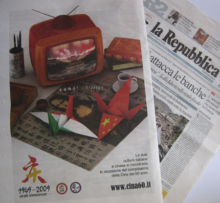 中新網(wǎng)10月3日電 據(jù)意大利《歐聯(lián)時(shí)報(bào)》報(bào)道,日前,在意大利佛羅倫薩學(xué)生學(xué)者聯(lián)誼會(huì)精心策劃下,中國國慶六十周年的宣傳廣告于10月1日被刊載在意大利共和國報(bào)紙上。廣告刊出后,引起了社會(huì)各界的高度關(guān)注,社會(huì)各界不約而同地把目光投向了中國,聚焦在中國60華誕的慶典活動(dòng)。