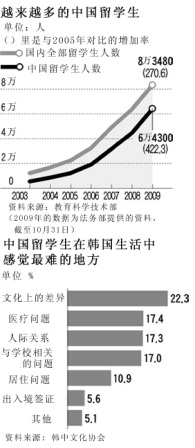 在建國大學(xué)上學(xué)的中國留學(xué)生唐燁最近不看韓國電視,因為在韓國電視劇里中國經(jīng)常被歪曲成很不好的樣子,在新聞中也頻頻出現(xiàn)中國假冒偽劣產(chǎn)品的題材。他吐露說:“韓國媒體好像都喜歡貶損中國”,“電視劇《該隱與亞伯》里,中國被描寫成很負(fù)面的形象,中國留學(xué)生們都很憤慨”。截至10月31日,在韓國國內(nèi)滯留的中國留學(xué)生已達(dá)到64300人,占全體外國留學(xué)生的77%(83480人)。他們的韓國生活中最大的苦惱是什么呢?