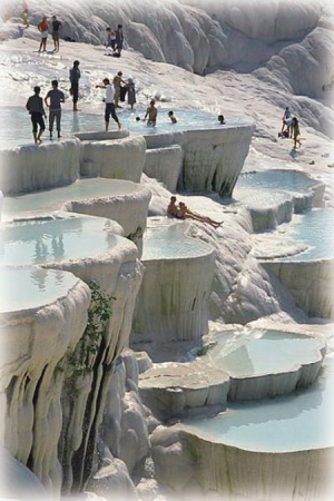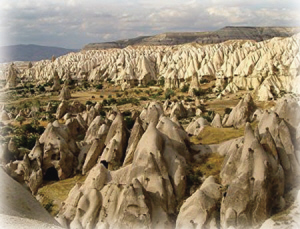 卡帕多奇亞位于土耳其安那托利亞(Anatolia)的腹地,在歷史上有很長一段時間與世隔絕,不通音信。在這里,自然的偉大力量鍛造出了世上獨一無二的神奇地貌。這種地貌的形成起源于幾百萬年前Erciyes、Hasandag和Golludag三座火山的噴發(fā)。噴出的大量巖漿冷卻、鈣化,凝固成的風(fēng)化巖層具有良好的可塑性,易于受腐蝕。之后,較耐腐蝕的玄武質(zhì)火山巖覆蓋了松軟的風(fēng)化巖層。隨著時光的流逝,玄武質(zhì)巖石碎裂,變得疏松,將松軟的風(fēng)化巖重又暴露出來。慢慢地,除了被玄武巖象傘一樣遮蓋起來的地方外,雨水把風(fēng)化巖石侵蝕出一條條溝壑,形成了陡峭的神奇煙囪景觀(fairy chimneys)。