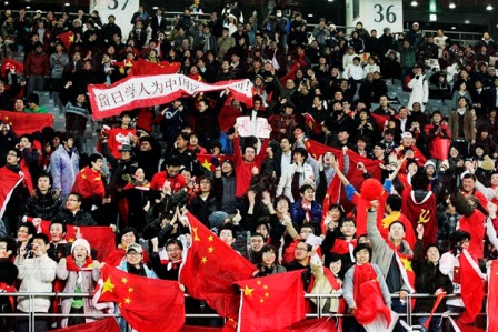 中新網(wǎng)2月11日電 據(jù)日本《中文導(dǎo)報(bào)》報(bào)道,2月10日,東亞四強(qiáng)賽進(jìn)行第二輪爭(zhēng)奪,在東京味之素體育場(chǎng)中國(guó)男足迎戰(zhàn)韓國(guó)男足,中國(guó)隊(duì)最終以3-0大勝韓國(guó)隊(duì),一舉改寫在國(guó)際A級(jí)賽事上32年對(duì)韓不勝的尷尬歷史。看臺(tái)上約二千名中國(guó)留學(xué)生的吶喊助威聲也貫穿了整場(chǎng)比賽。