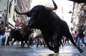 自從海明威的小說《太陽(yáng)照常升起》問世,特別是他獲得諾貝爾文學(xué)獎(jiǎng)以后,世界上越來越多的人就知道了西班牙的奔牛節(jié),知道了在那個(gè)最浪漫的國(guó)度有一種最浪漫的節(jié)慶,其宣泄程度遠(yuǎn)非任何一種狂歡節(jié)可比。想一想斗牛場(chǎng)上那滿身是血、橫沖直撞、兇悍無比的大公牛,如果與它們一起狂奔共舞,而且是成千上萬的年輕人與它們一起瘋狂奔跑在一條狹窄的街道上,那該是何等的刺激!于是,在無數(shù)人的想像中,西班牙奔牛節(jié)就意味著勇敢、浪漫、刺激和瘋狂的宣泄,同時(shí)也必定險(xiǎn)象環(huán)生。