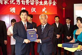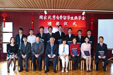 董大使首先向獲獎(jiǎng)?wù)吆退麄兊膶?dǎo)師及親人表示熱烈的祝賀,向留瑞學(xué)人表示親切的問(wèn)候。他指出,設(shè)立“國(guó)家優(yōu)秀自費(fèi)留學(xué)生獎(jiǎng)學(xué)金”是新時(shí)期貫徹國(guó)家“支持留學(xué),鼓勵(lì)回國(guó),來(lái)去自由”留學(xué)工作方針的重要舉措,自2003年設(shè)立以來(lái)累計(jì)獲獎(jiǎng)人數(shù)已達(dá)1900余人。2009年度共497人獲獎(jiǎng),其中瑞士有15位在校博士生獲得這一殊榮。這是歷年來(lái)獲獎(jiǎng)人數(shù)最多的一次,顯示了在瑞士中國(guó)留學(xué)人員的實(shí)力和水平。
