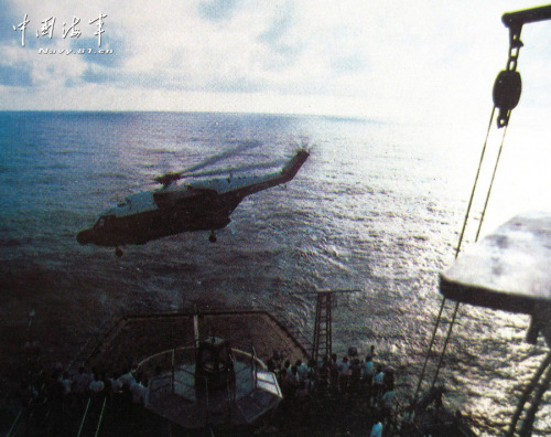 10月12日,天氣格外晴朗。發(fā)射導(dǎo)彈試驗任務(wù)一切準備就緒。這天下午14時30分,我率領(lǐng)機組人員精神抖擻地快步走到飛行甲板,地勤人員早已將飛機拉出機庫準備好,等待飛行員檢查。 一切良好!我和機組人員充滿信心地跨入駕駛艙,系好安全帶,等待起飛的命令。14時48分,艦上飛行指揮員、團長郭文才向機組發(fā)出了“開車”的命令,空中機械師立即啟動發(fā)動機,頓時旋翼飛轉(zhuǎn)、馬達轟鳴。14時53分,指揮員發(fā)出了“起飛”的命令,我立即向甲板指揮員發(fā)出“解除系留”的信號,“系留已解除!”我立即接通自動駕駛儀,上提變距桿,飛機“刷”的一下離開甲板,低著頭吼叫著離艦起飛。