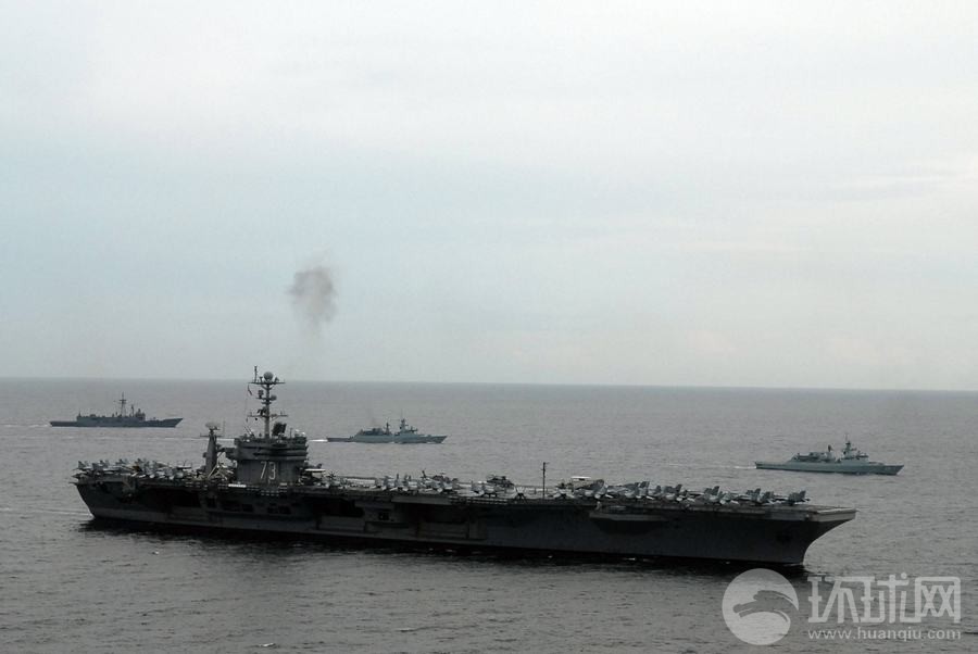 馬來西亞海軍戰(zhàn)艦與美軍華盛頓號航母組成編隊(duì)航行