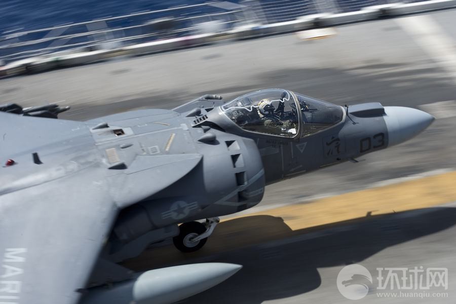 在此次美菲聯(lián)合登陸演習(xí)中,一架AV-8B鷂式戰(zhàn)斗機從好人理查德號兩棲攻擊艦上起飛。