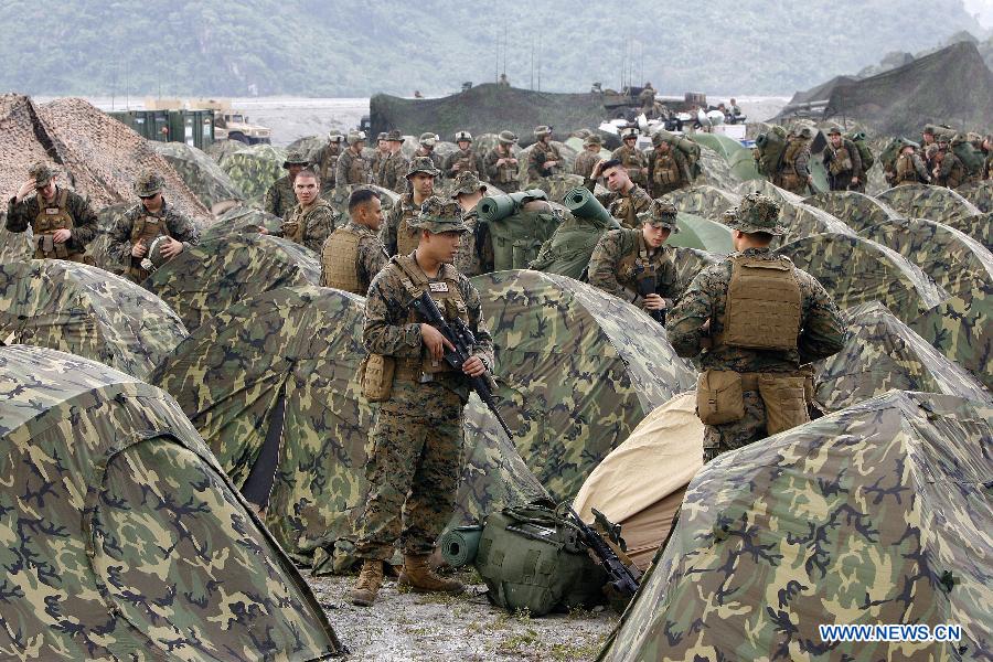美菲兩棲聯(lián)合軍演第二天,當天來自美國兩極攻擊艦“好人理查德”號上的約120名美國海軍陸戰(zhàn)隊員和約30名菲律賓海軍陸戰(zhàn)隊員來到了菲律賓塔拉省的烏鴉峽谷,參加直升機突襲項目的演習。