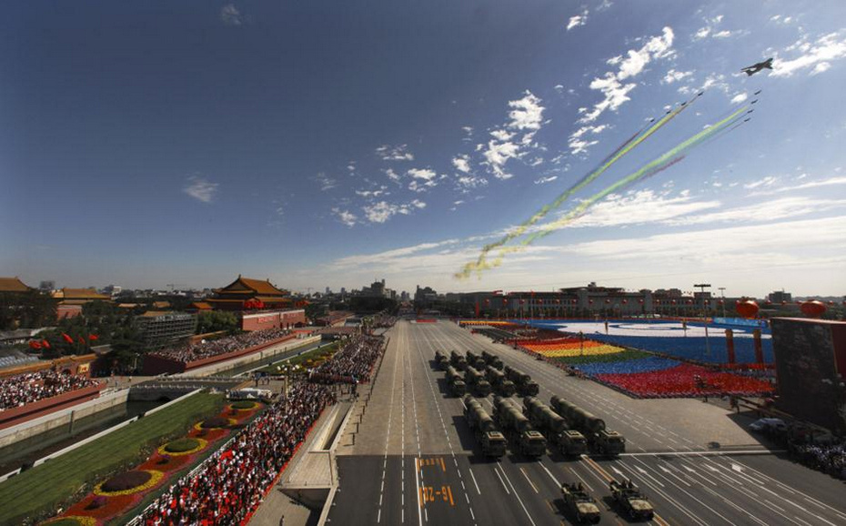 2009年10月1日,慶祝中華人民共和國成立60周年首都閱兵式上,多機(jī)編隊(duì)的領(lǐng)隊(duì)梯隊(duì)飛過天安門廣場。新華社記者 費(fèi)茂華 攝