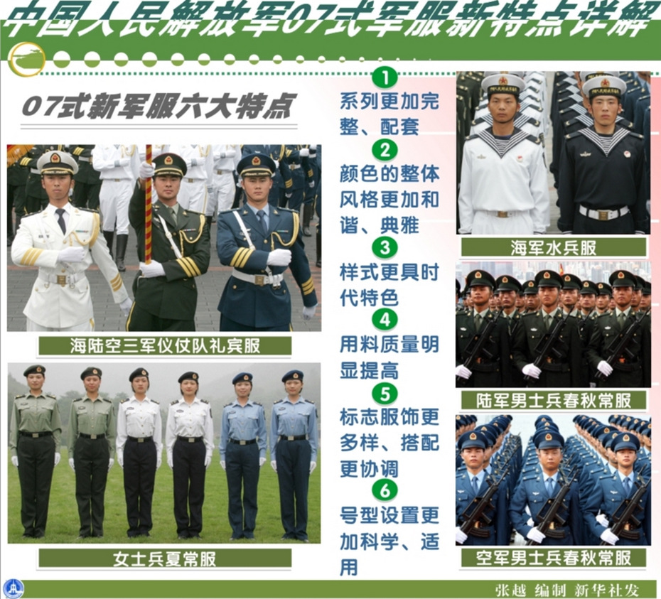 這是中國(guó)人民解放軍07式軍服新特點(diǎn)詳解的圖表。2007年7月起,全軍官兵陸續(xù)穿上07式軍服。這次我軍歷史上規(guī)模最大最系統(tǒng)的換裝,涉及禮服、常服、作訓(xùn)服和標(biāo)志服飾4個(gè)系列700多個(gè)品種。新華社發(fā)