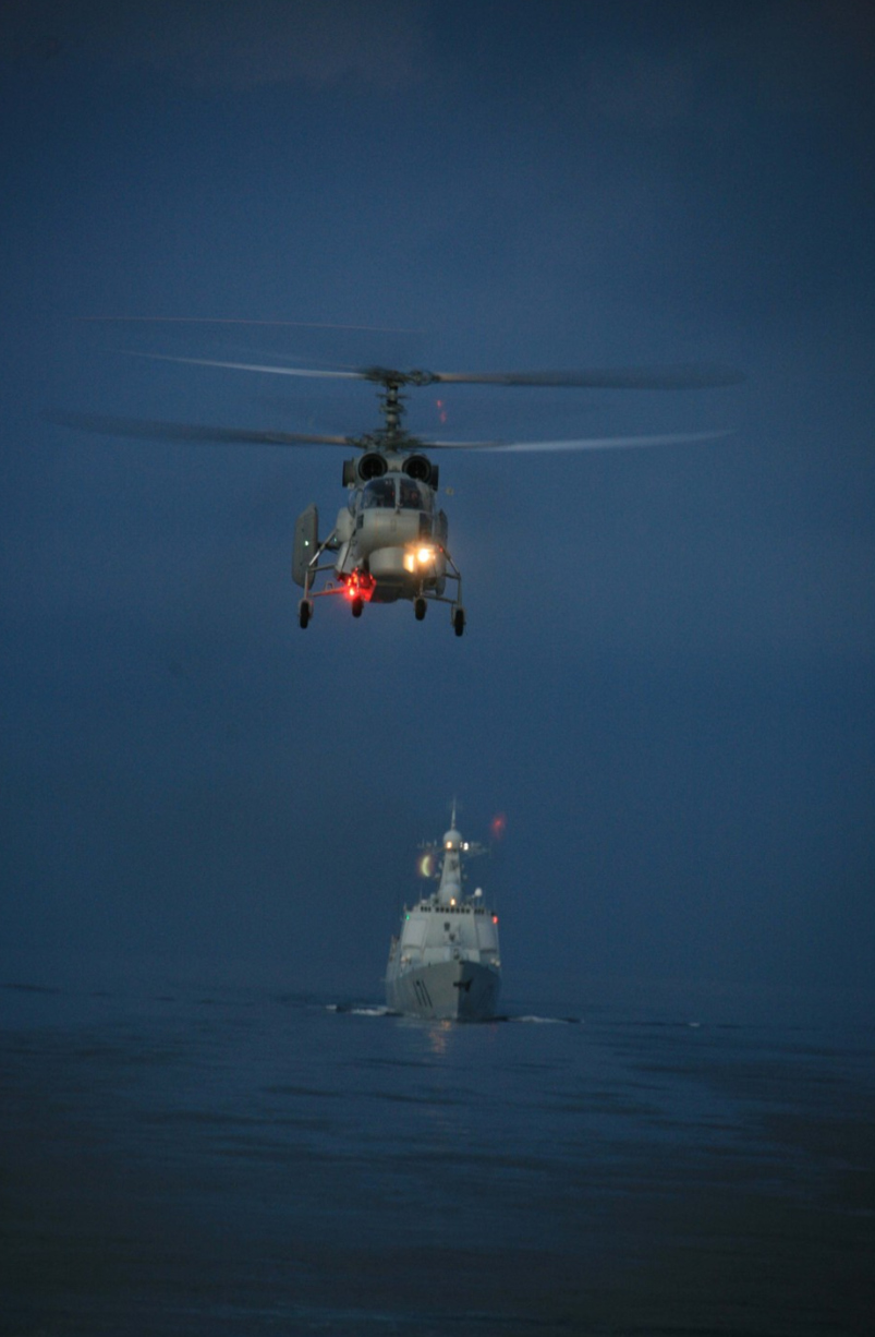 2008年12月28日夜,中國赴亞丁灣、索馬里海域護(hù)航編隊(duì)組織夜間直升機(jī)行進(jìn)間著艦訓(xùn)練。越來越多的中國軍人,正在以各種方式走出國門,走上國際舞臺。聯(lián)合國維和、國際人道主義救援、海外護(hù)航、中外軍隊(duì)聯(lián)演聯(lián)訓(xùn)、軍事友好訪問,處處展現(xiàn)出和平之師的良好形象。2008年12月26日,中國海軍艦艇編隊(duì)首次遠(yuǎn)赴亞丁灣、索馬里海域,為過往商船護(hù)航。截至2012年7月,先后有12批護(hù)航編隊(duì)參加護(hù)航任務(wù),安全護(hù)送474批共4727艘中外船舶。新華社發(fā)
