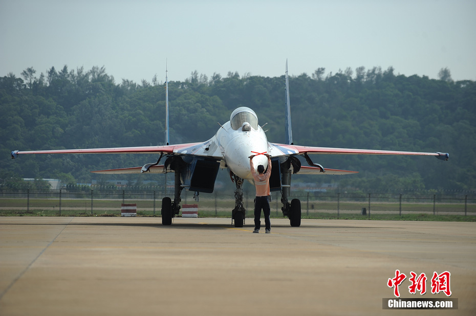 俄羅斯勇士飛行表演隊(duì)蘇27抵達(dá)珠海航展現(xiàn)場(chǎng)。陳海峰 攝