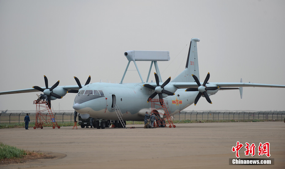 空警-200機(jī)載雷達(dá)天線類似體操用的平衡木,是中國(guó)自行研制的一種輕型、全天候空中型預(yù)警飛機(jī),在運(yùn)8C型機(jī)基礎(chǔ)上進(jìn)行了80%以上改動(dòng)而成。曾在2009年國(guó)慶閱兵中現(xiàn)身。陳海峰 攝