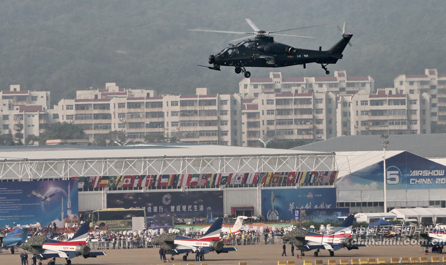 11月13日,我國(guó)自主研制生產(chǎn)的武直-10武裝直升機(jī)亮相在珠海舉行的第九屆中國(guó)國(guó)際航空航天博覽會(huì),在飛行表演中展示了這款直升機(jī)的優(yōu)良性能。記者喬天富攝
