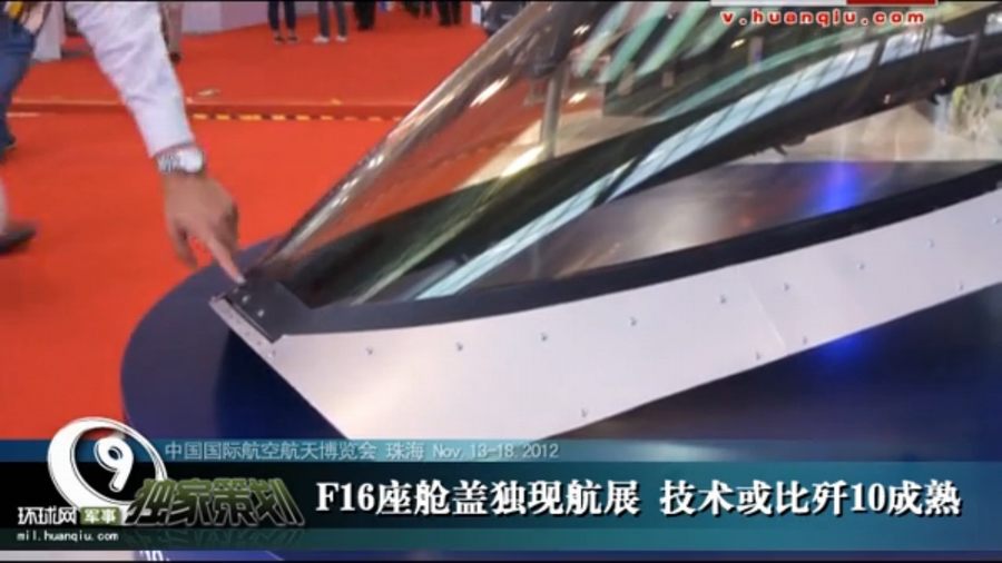 參展商英國(guó)漢堡森航空航天公司展出的F-16一體成形座艙罩(環(huán)球網(wǎng)視頻截圖)