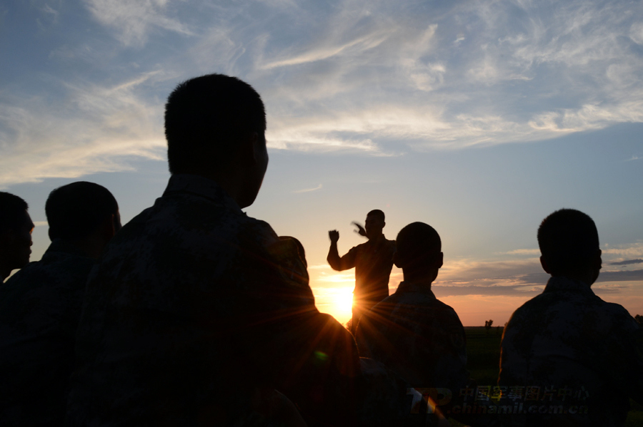 官兵在夕陽(yáng)下學(xué)唱俄羅斯歌曲