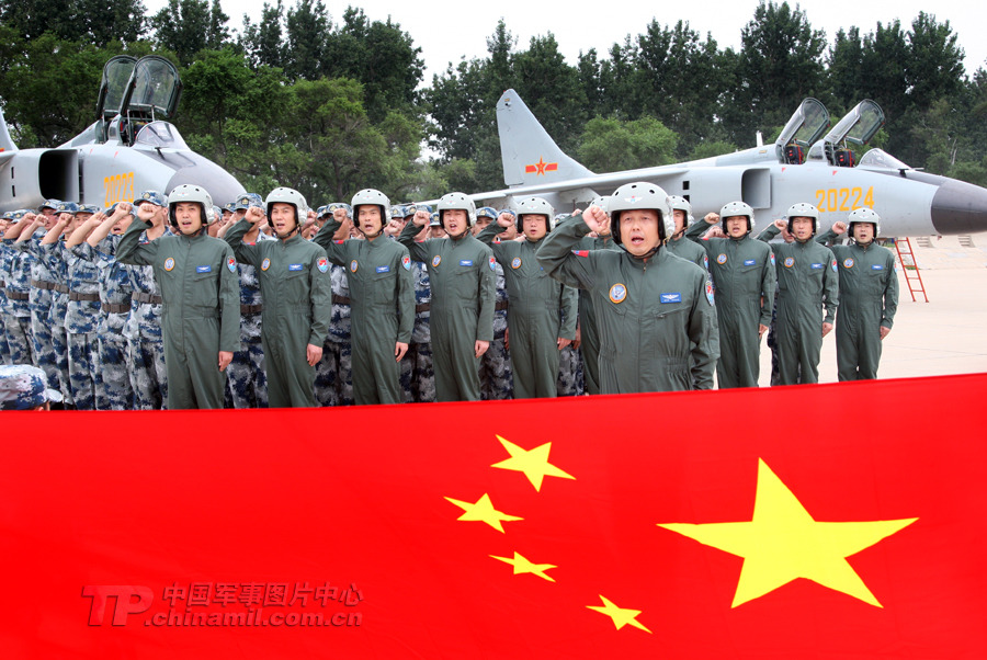 7月27日,參加中俄聯(lián)演的空軍戰(zhàn)斗群官兵出征前在國(guó)旗前集體宣誓,立志圓滿完成聯(lián)演任務(wù),為祖國(guó)爭(zhēng)光。 曹占禮 攝(來源:中國(guó)軍網(wǎng))