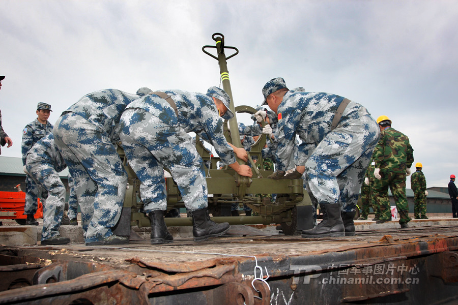 7月27日,參加中俄聯(lián)演的空軍戰(zhàn)斗群地轉(zhuǎn)官兵在滿洲里火車站正往俄方專列上裝載裝備。 曹占禮 攝