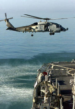 美海軍SH-60“海鷹”直升機主要用于反潛、反艦攻擊,搜索與救援等任務(wù)。它由驅(qū)逐艦搭載,“海鷹”可以裝備聲波定位器、MK46或MK50型魚雷、AGM-119型“企鵝”導(dǎo)彈及50口徑機炮等。