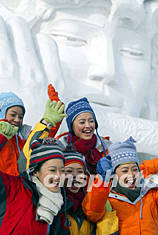來自世界各地的世界華裔小姐評選參賽佳麗,十二日在哈爾濱冰雪博覽會上的牧羊女雪雕前拍攝外景,給美麗的潔白世界增添艷麗色彩。作者:毛建軍