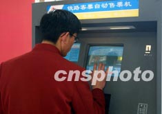 十七日,上海正式打響為期四十天的“春運(yùn)保衛(wèi)戰(zhàn)”。為緩解春運(yùn)期間旅客售票難的問題,上海推出“鐵路客票自動(dòng)售票機(jī)”,一位旅客應(yīng)用電腦觸摸信息購票。作者:湯彥俊