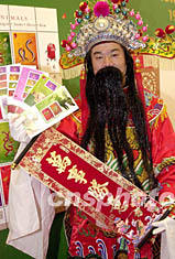 香港郵政署1月19日發(fā)行十二生肖(羊年)特別郵票,郵政署邀請財(cái)神展示羊年特別郵票首日封,并祝市民萬事勝意。鄧慶樂 攝