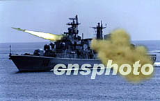 中央軍委授予海軍哈爾濱艦“海上先鋒艦”榮譽稱號命名大會二十六日在青島某軍港舉行。海軍哈爾濱艦是中國國產某新型導彈驅逐艦首艦。圖為哈爾濱艦發(fā)射反艦導彈。作者:王松岐
