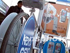 北京春節(jié)前夕的手機(jī)市場更加火爆,一家手機(jī)公司別出心裁的利用自行車在街頭做起了廣告。作者:杜洋