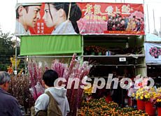 在人流多的香港維園年宵市場,港產(chǎn)電影“老鼠愛上貓”為加強宣傳,在花檔高高掛上宣傳海報。鄧慶樂 攝