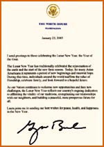布什總統(tǒng)二十九日發(fā)布賀詞說(shuō),農(nóng)歷新年的傳統(tǒng)是慶祝大地復(fù)蘇和新的耕作時(shí)節(jié)的開(kāi)始。如今,對(duì)于許多美國(guó)亞裔來(lái)說(shuō),它標(biāo)示著新開(kāi)端和新希望的降臨。在這段時(shí)間里,世界各地的人們重新確認(rèn)友誼的價(jià)值,慶祝家庭團(tuán)圓,期待著一個(gè)充滿希望的未來(lái)。