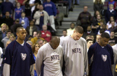 美國航天飛機哥倫比亞號于北京時間昨天晚間失事,機上全部7名宇航員全部罹難。圖為美國NBA比賽開始前,新澤西網(wǎng)隊隊員為遇難者進行默哀。他們在今天比賽中的對手是底特律活塞隊。