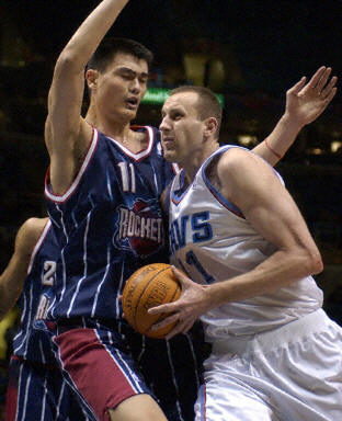 姚明在比賽中防守伊爾高斯卡斯。