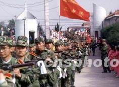 解放軍軍事經(jīng)濟(jì)學(xué)院的學(xué)員隊伍新春展開行軍演練,途中在湖北省谷城縣受到百姓官員夾道歡迎。作者:王偉兵
