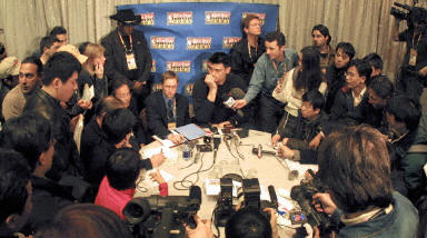 當(dāng)?shù)貢r(shí)間2月7日,NBA全明星賽在亞特蘭大舉行記者招待會(huì)。姚明在記者會(huì)上回答來(lái)自全世界各國(guó)媒體記者的提問(wèn)。文章說(shuō),在接受采訪的時(shí)候,眾多的攝像機(jī)都在等待著他的出現(xiàn),他出現(xiàn)后,全場(chǎng)鎂光燈頻閃,而為了讓他到桌前接受記者的提問(wèn),工作人員必須為他艱難的開(kāi)辟一條路。