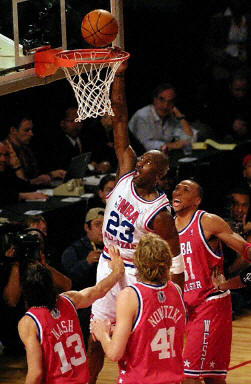 去年以狀元秀身份加盟休斯頓火箭隊(duì)的中國(guó)球員姚明,以首發(fā)身份為西部聯(lián)盟全明星隊(duì)出戰(zhàn)。比賽剛開始,姚明就接到隊(duì)友傳球,扣籃成功,為球隊(duì)貢獻(xiàn)兩分。在上半場(chǎng),姚明上場(chǎng)10分鐘,1投1中,2個(gè)籃板球,2分。