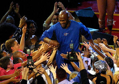 中場休息時,美國著名流行歌曲天后瑪利亞-凱莉身著喬丹的23號戰(zhàn)袍,為這位籃壇的神一般的傳奇人物獻歌。隨后瑪利亞-凱莉介紹喬丹出場,喬丹受到了全場球迷的歡呼,全場球迷都起立向他致敬。喬丹發(fā)飆了談話,對球迷表示了感謝,感謝家庭,感謝球迷對他的支持。喬丹表示,我現(xiàn)在把火炬?zhèn)鹘o年輕人,就象我從約翰遜等人傳給我一樣。隨后,他與其他全明星隊員一一擊掌致意。