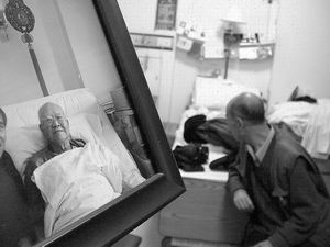 協(xié)和醫(yī)院A級(jí)二病房里袁先生病床的床頭上還掛著兩排醒目的賀年卡,其中一張寫著“早日康復(fù),壽比南山”的卡片是袁先生兒子袁偉承寄來的。病床邊上的病歷本詳細(xì)記錄著袁先生住院期間每天的病況。在病房里,還放著一張?jiān)壬诓≈信c兒子袁偉承的大合影,照片上的袁先生笑得很燦爛。
