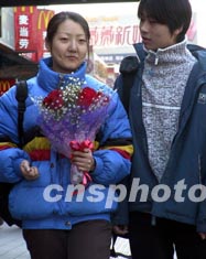 北京姑娘在“情人節(jié)”當(dāng)天得到男友一束鮮花。這一天,在西單商業(yè)街,這種場(chǎng)面比比皆是。作者:鄒憲