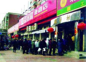 中午1點(diǎn)10分,記者在勁松橋西北角的稻香村分店門口看到,排隊的顧客有180多人,隊伍一直向西遮擋了該店隔壁兩家店鋪的街面,蜿蜒到了一棟宿舍樓前。排在最后的顧客已經(jīng)開始聊天解悶。商店門口的柱子上則貼著“每人限購4斤”的告示,兩名男營業(yè)員站在柜臺外維持秩序,正在買元宵的顧客說,自己9點(diǎn)多就排上了,都快沒信心了才輪到。