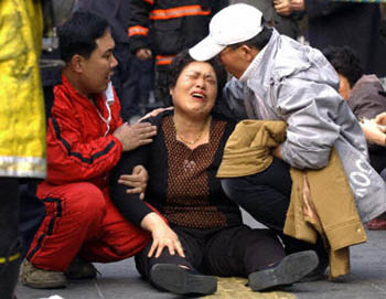 韓國警方表示,韓國當?shù)貢r間18日上午9:55韓東南部城市大丘發(fā)生地鐵縱火事件,造成百余人傷亡。圖為遇難者家屬痛哭欲絕。