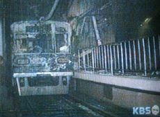 韓國(guó)警方表示,韓國(guó)當(dāng)?shù)貢r(shí)間18日上午9:55韓東南部城市大丘發(fā)生地鐵縱火事件,造成百余人傷亡。圖為地鐵站內(nèi)被焚燒過(guò)的地鐵列車。