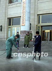 工作人員二十三日在北京人民大會(huì)堂門外清理地面灰塵,迎接將于三月初召開的第十屆全國人民代表大會(huì)與全國政協(xié)十屆會(huì)議。作者:毛建軍